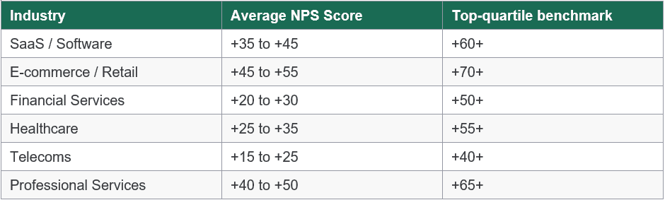 NPS is only meaningful in context. A score of +35 in telecoms represents strong performance; the same score in SaaS suggests meaningful room for improvement. Use the industry benchmarks below when setting targets and interpreting results.