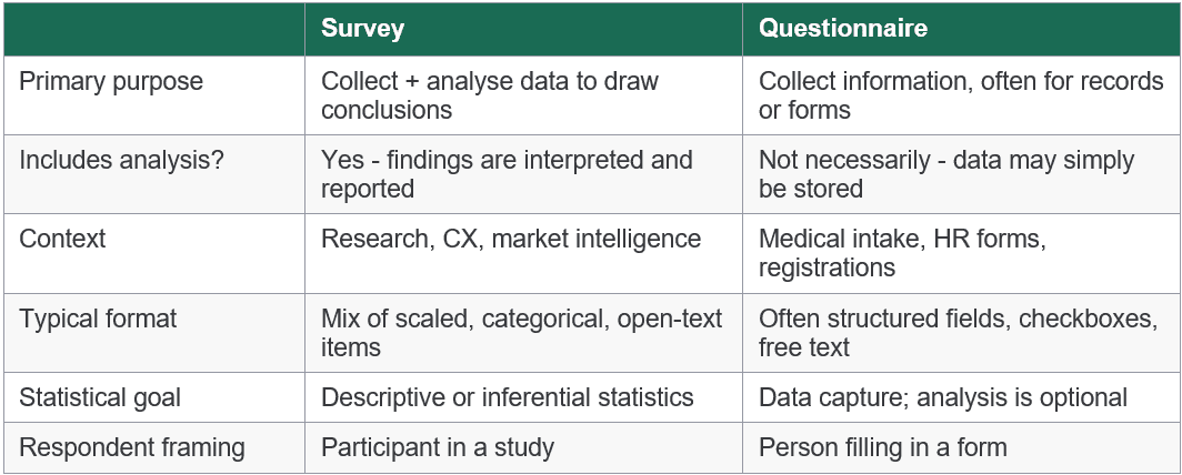 Put another way: every survey uses a questionnaire, but not every questionnaire is part of a survey. A medical intake form is a questionnaire. A patient satisfaction study that uses a validated questionnaire, samples a representative group of patients, analyses responses statistically, and produces a report - that is a survey.