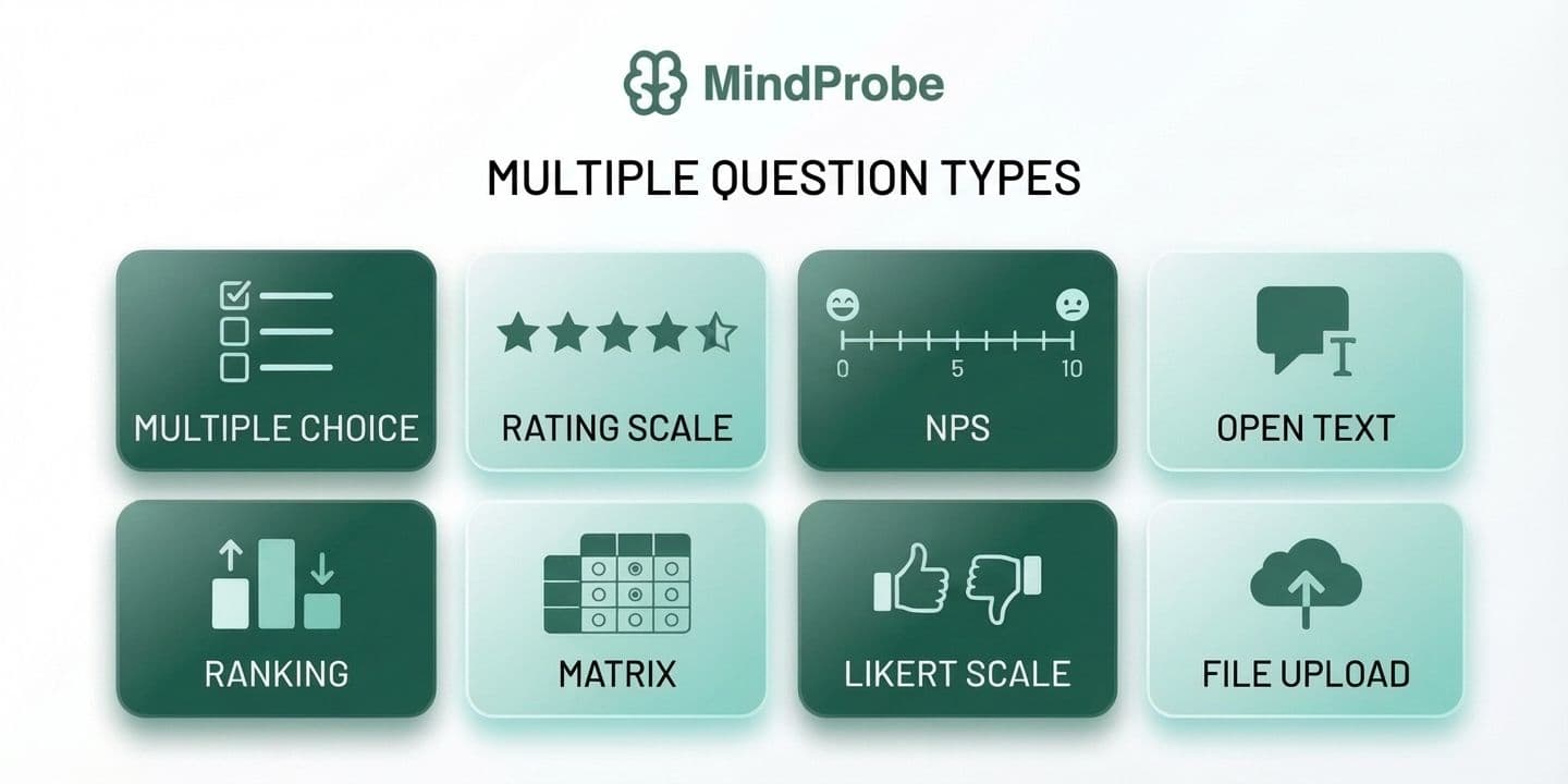 MindProbe supports 30+ question types across all six categories - choice, input, scale, ranking, personal information, and advanced - giving teams the full toolkit without platform-switching. For a full treatment of every format, when to use it, and how to write it well, read our Survey Question Types: The Complete Guide.