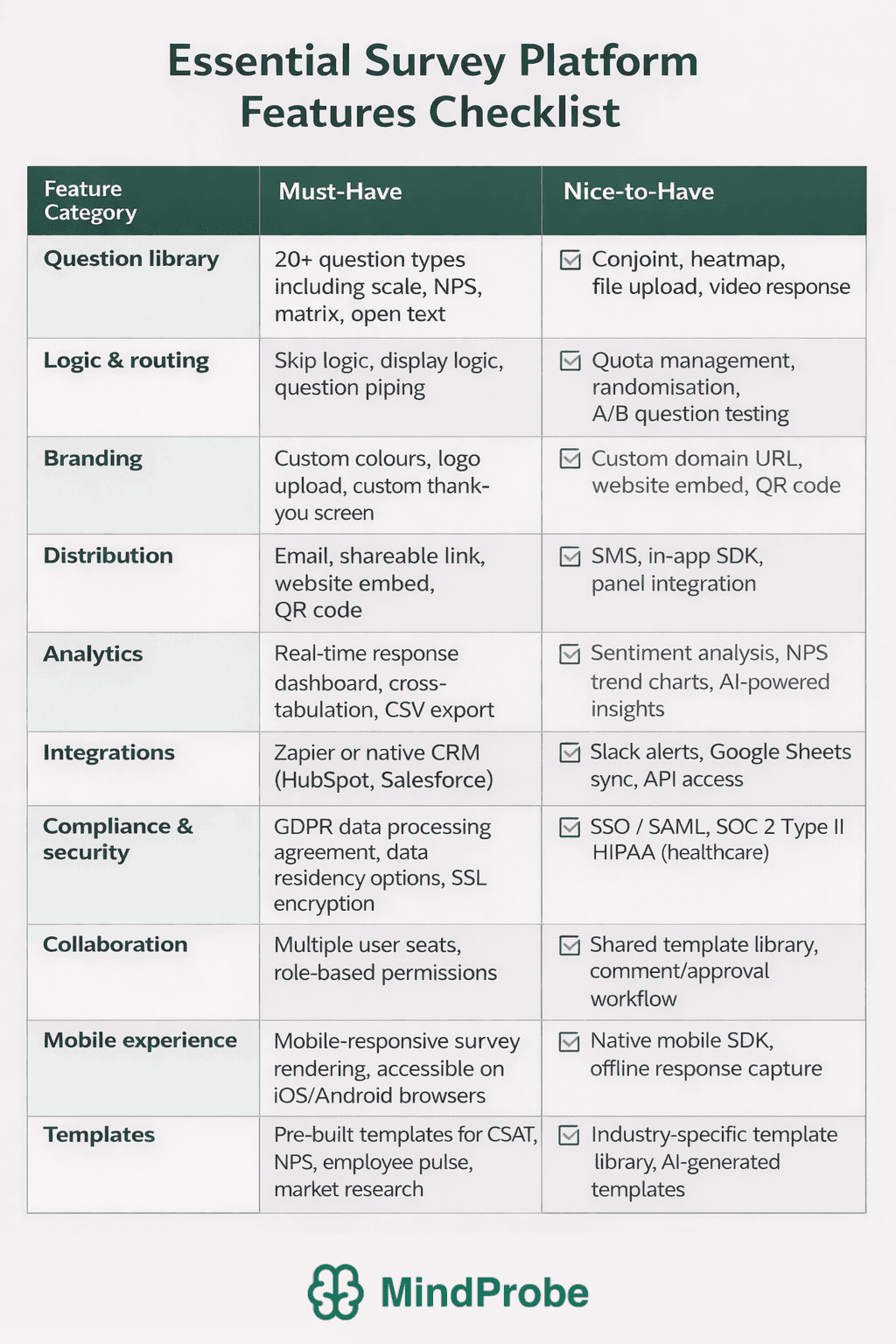 Use this checklist when evaluating any survey platform. It is structured into must-have capabilities - the features a platform needs to support a professional survey programme - and nice-to-have capabilities that differentiate platforms at the higher end of the market.